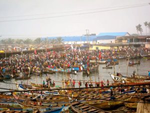 Fortunately, the rest of the weekend made this hellish-journey worth it. Elmina is a charming fishing town reminiscent of old towns in East Africa, with low-lying white washed buildings and colorful boats littering the dock. It was an almost mediteranean feel, and reminded me distinctly of Alexanderia’s coastline in Egypt. The town is absolutely abuzz, as the fish market hits full swing. We first visit Elmina castle, a trade castle around 500 years old, known primarily for it’s Slave Trade. The dungeons were of course, the emphasis of the tour, and true to their stories, horrendous. The worst, was a room with a skull and cross-bone deemed “door of no return,” and you can imagine it’s function. The view however was fantastic, overlooking the town and surrounding hills to the north, and sea to south, with the strong tide crashing over extruding boulders near shore.