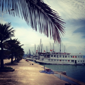 Our first day we drove the three and a half hours to the port where we would meet our boat and have lunch. All of us were waiting in anticipation to see the boat, for we all had heard stories of the boats looking pristine in the tour catalog and being an absolute mess once you get there. One even sunk last year killing several people. So we were delighted to find our boat to be in great condition. Our rooms were small, but clean and even boasted AC. We were served lunch, which was also better than expected and set sail around the bay. After lunch we boarded kayaks near a floating village and paddled our way through caves that let out into secluded bays with cliffs shooting straight up, blocking the sun and casting a chill over the water. The small village had a few dozen houses floating on rafts scattered around the bay. There is one school, and a store in which fish are stored in nets in the water and fished out on demand. That was it. The residents lay sleepily in hammocks on their porch or prepared food behind their house while bobbing in time to the crests of the current passing through. We also stopped at a cave, which was impressive in it’s sheer size, but disappointing in the crowdedness and random neon lights used to illuminate the cave making it look fake.
