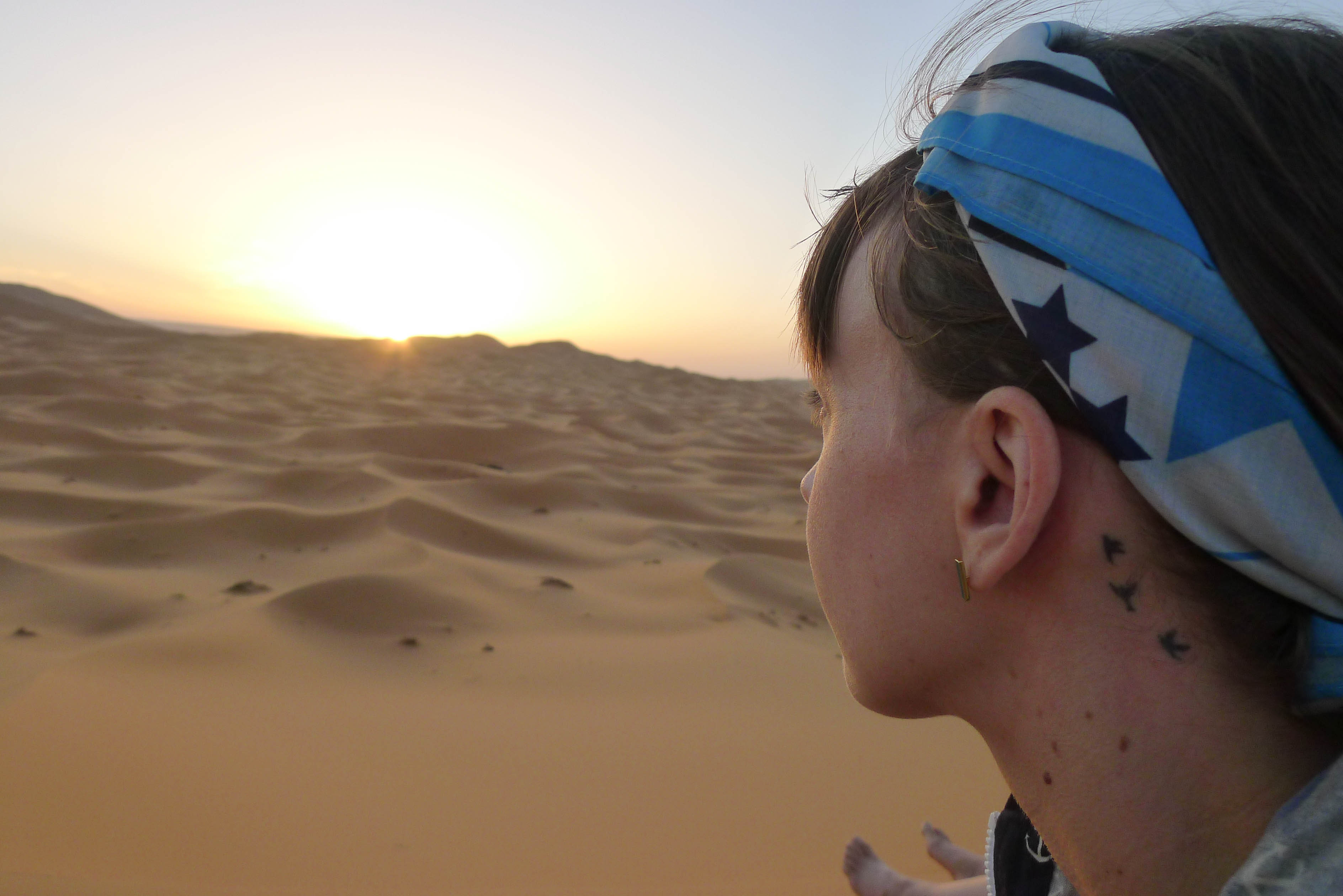 Unlike most deserts I’ve explored, once the sun sets here, the heat remains. Only now, instead of beating down from the sun it seems to rise up from the surrounding dunes, releasing their stored heat. By the time we made it to camp, the final remnants of light had completely faded. We would dine by candle-light in the sand. But we only had a few hours, our guide informed us, to eat and star-gaze, because soon the moon would rise and we’d no longer be able to see the stars. As we ate, we realized we hadn’t brought a torch for trips from our tent to the fully functioning flush-toilets. I still don’t understand how this was possible, nor the running water, but the torch would prove unnecessary. Once the moon rose, something I’ve never seen before-it looked somewhat like a sunrise, though muted, and more of a white than warm, yellow light, the dunes were illuminated, the stars no longer visible. By the time we went to bed, it was still quite warm, so instead of sleeping in the tents, our guide dragged our bed-which was an actual mattress and bed frame out under the stars since we had the camp to ourselves. So we slept under the stars, in the Sahara on a slightly lop-sided bed propped in the sands of the desert.
