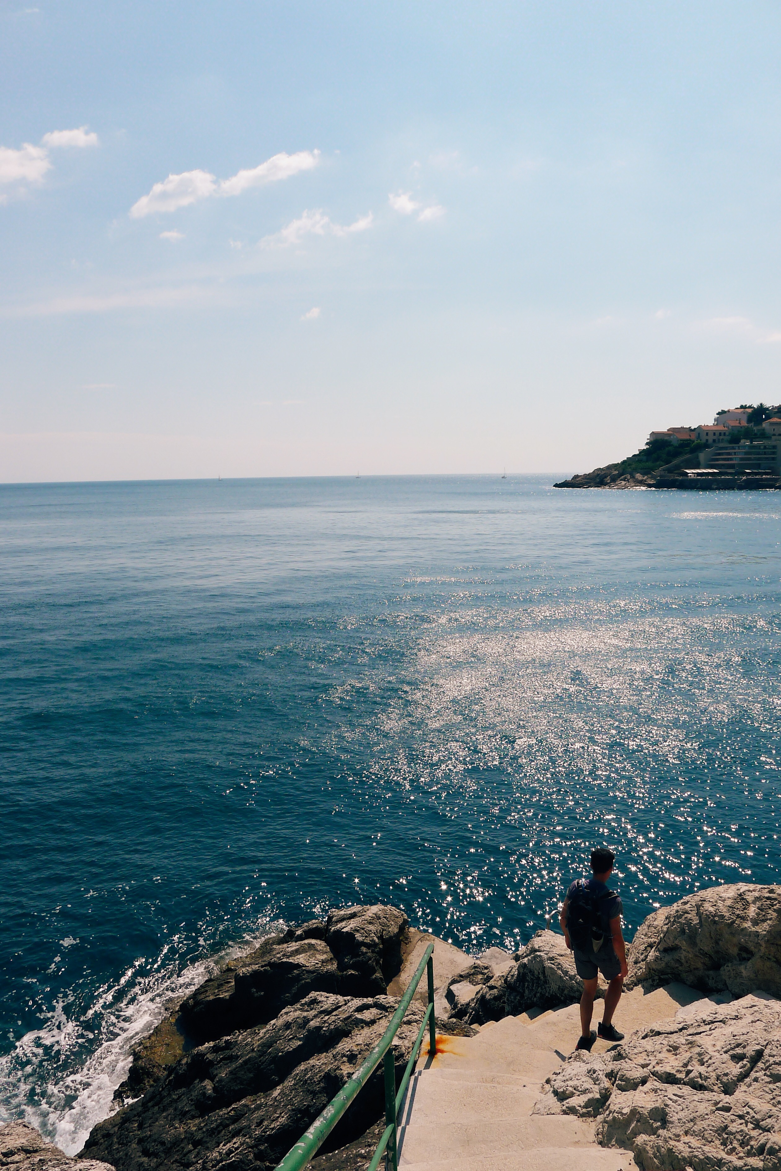 We found a less crowded area to sit and had lunch overlooking the city, our distaste for it slowly dissipating. After our hike down we realized we had more time than expected. The previous day we noticed off the main road leading from old town to Lapad there appeared to be a staircase winding down towards the sea. We decided to explore. It was very easy to find, and at the bottom was a small concrete area with a ladder leading into one of the calmer parts of the water, with stunning views of the cliffs and sea.